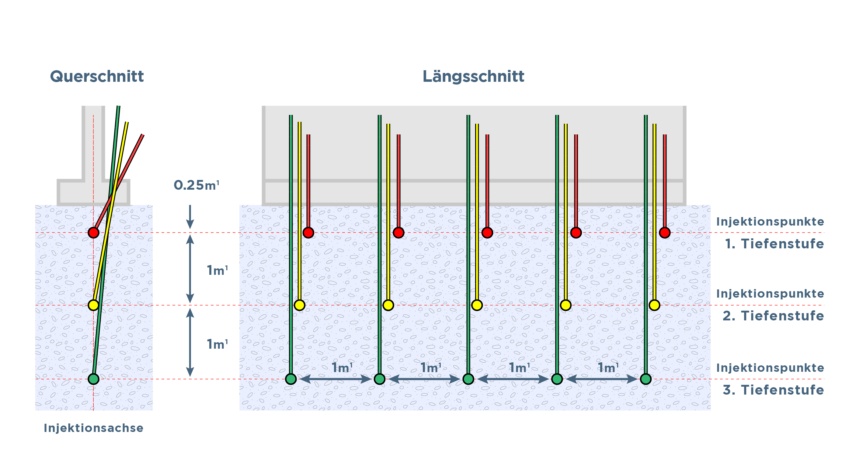 Die Injektionslanzen werden durch Vorbohrungen (Ø 32 mm) im Baugrund platziert. Nach Abschluss der Injektionsarbeiten bleiben die Lanzen auf Höhe OK Boden abgekappt im Baugrund und sind nicht nachinjizierbar.